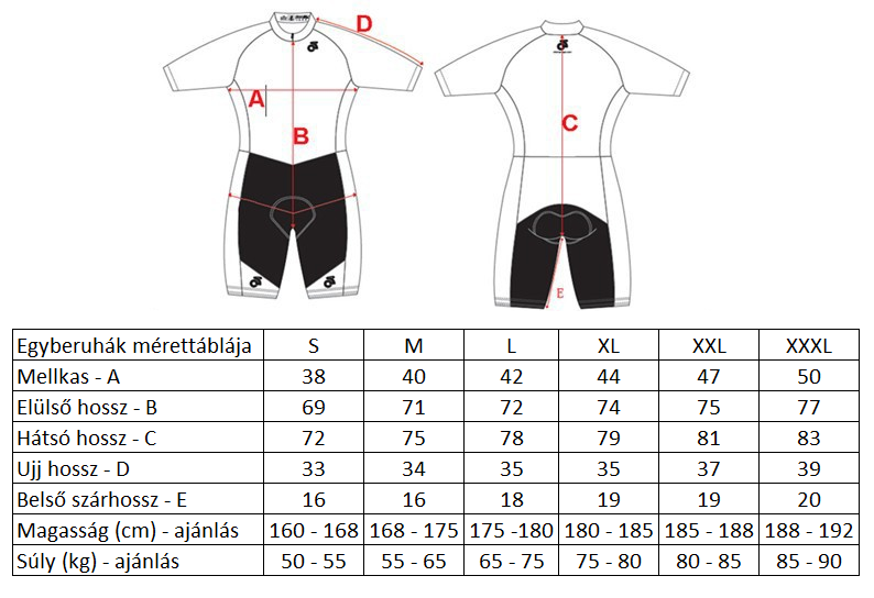A kerékpáros egybemezek mérettáblázata
